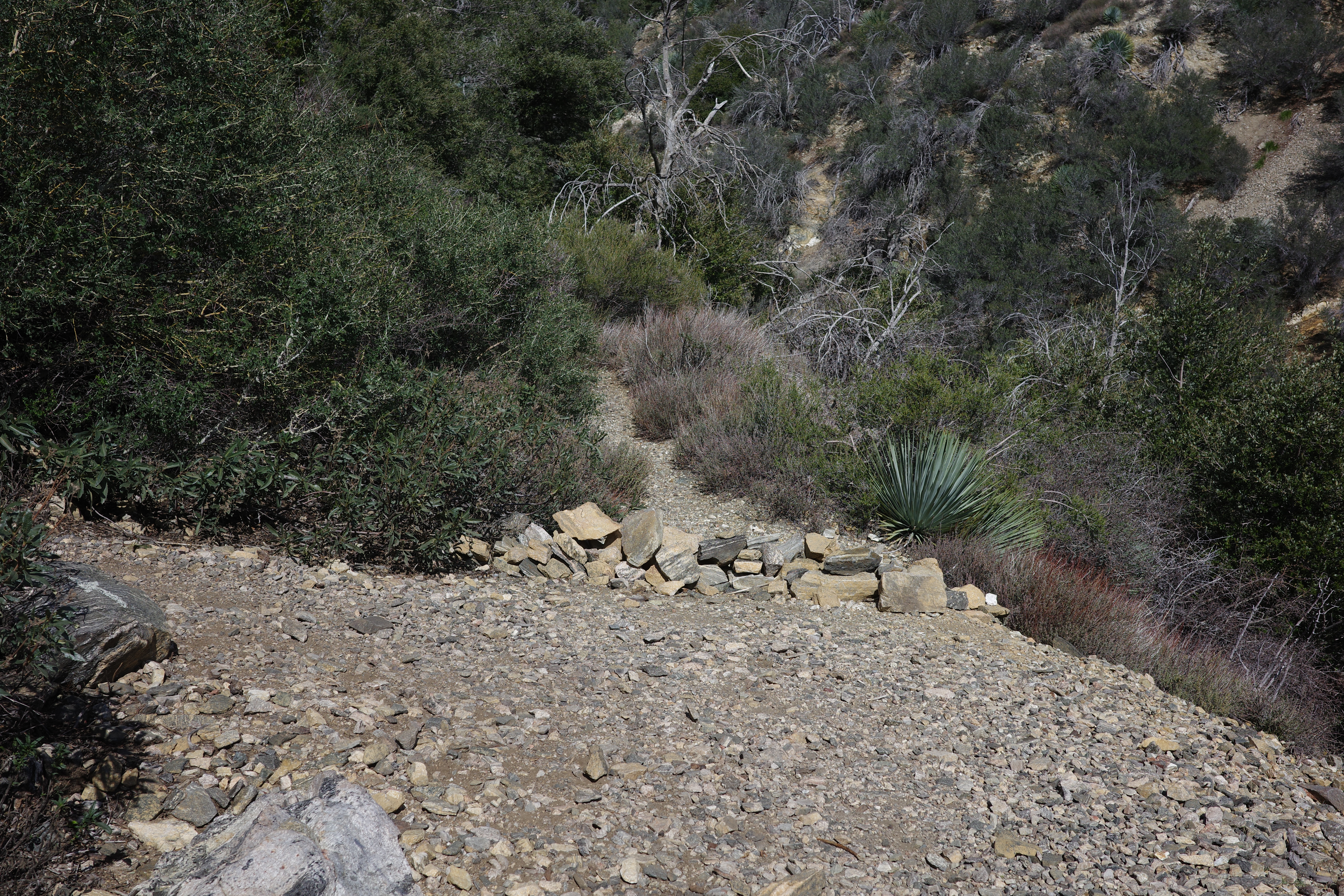 Then after a bit you hit a junction: the trail to Strawberry goes left, and the Barley Flats road goes straight. This is blocked off, because abandoned.