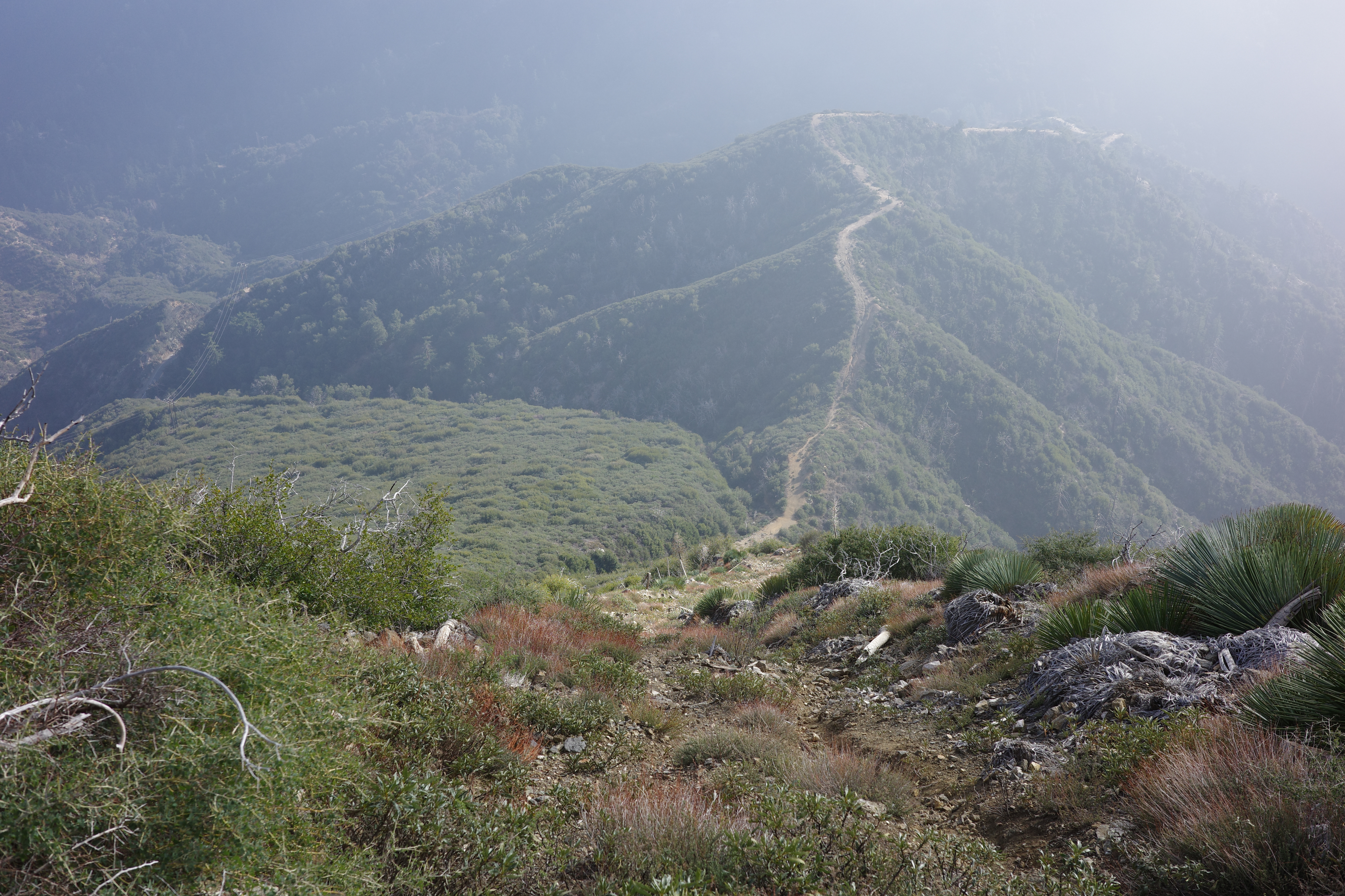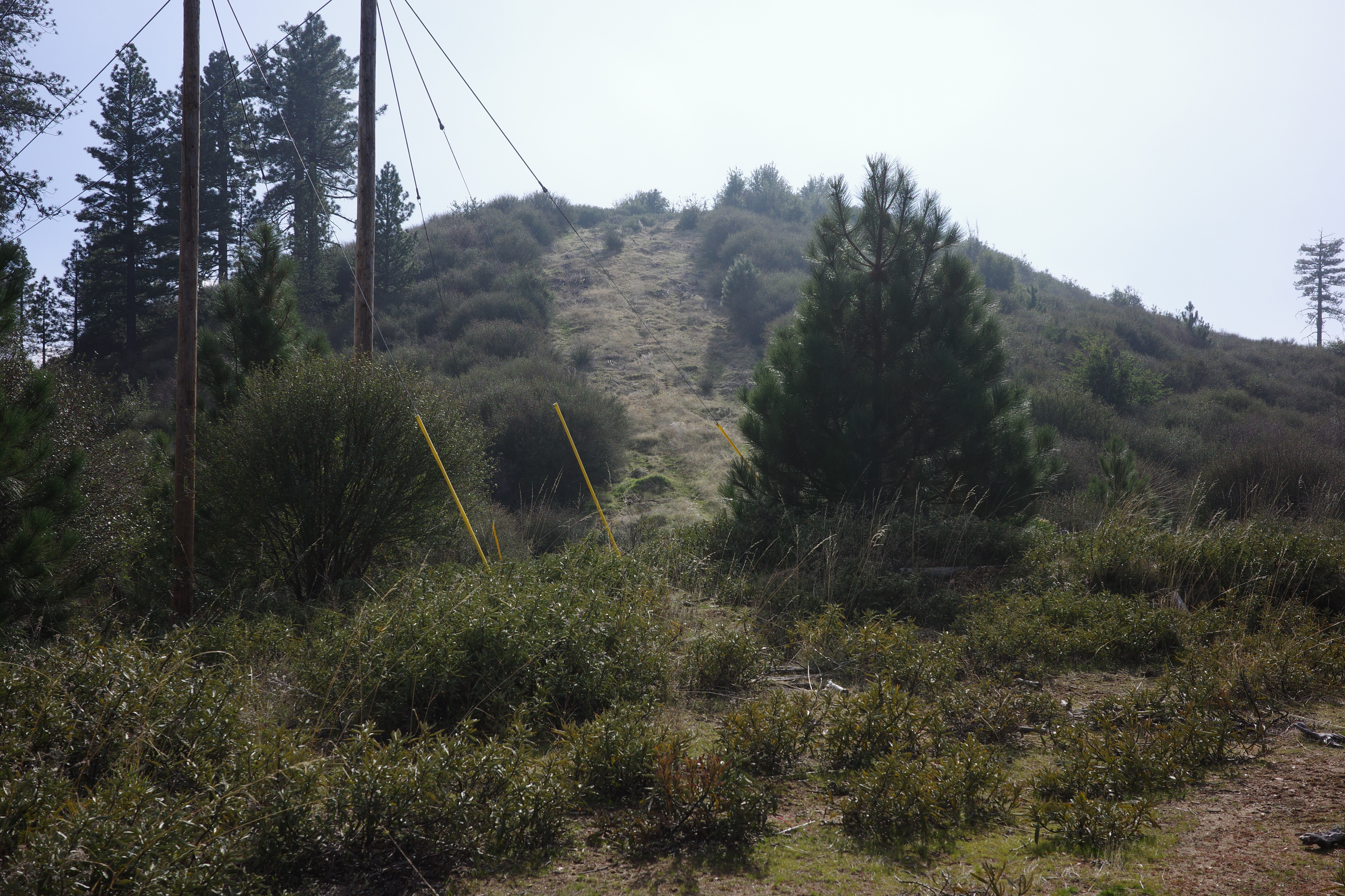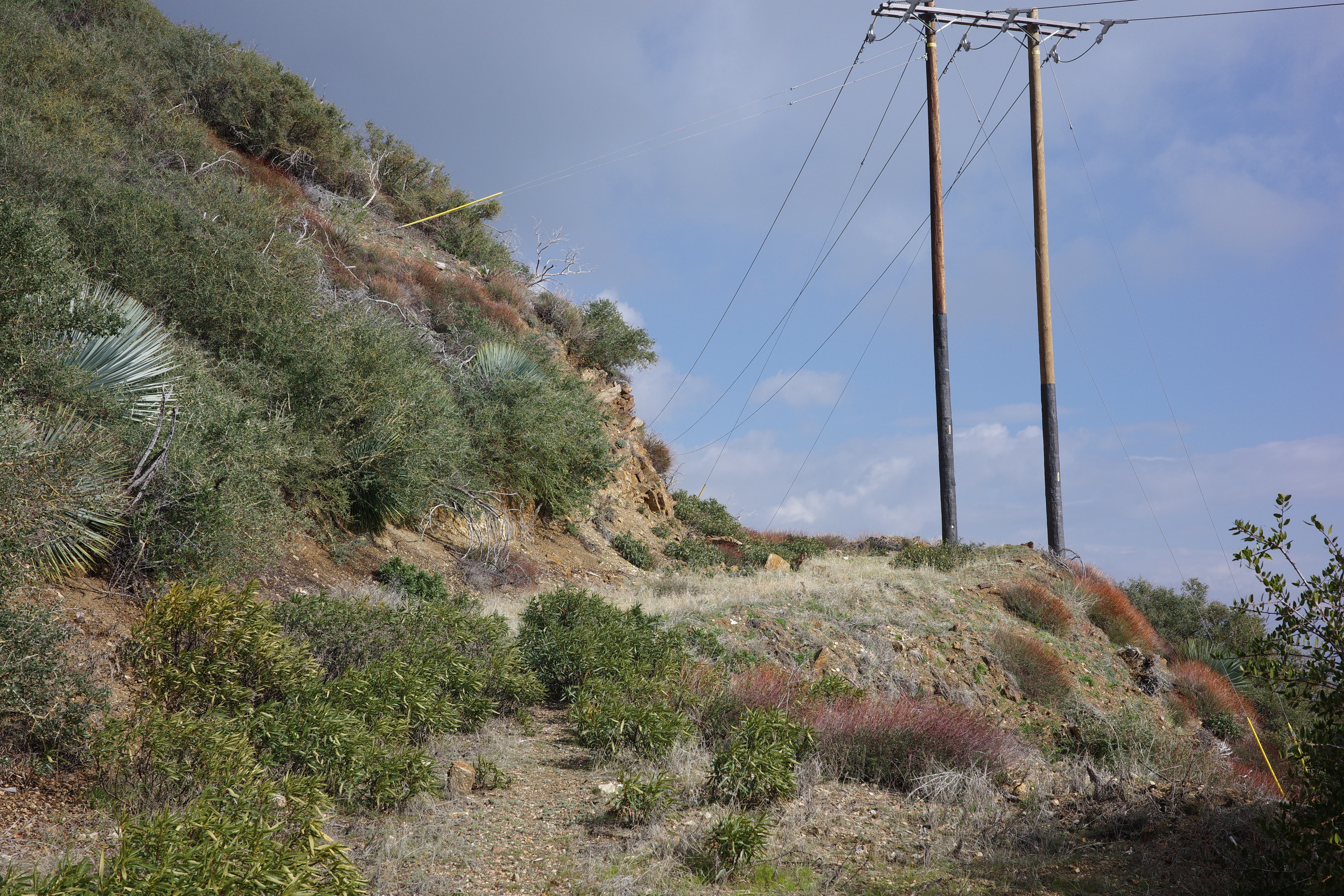 It's not bad. This road was used to service the powerlines. At some point newer power towers were built, with a wider spacing and a slightly different routing. Initially and at the end the new towers are in the same locations, and the road is clear. In the middle they diverge, and the road is overgrown. The route has at least a narrow footpath everywhere, and there's sign of old trail maintenance everywhere. I did a lot of cutting, and it is better now. With a dedicated effort this can be restored quickly-ish.