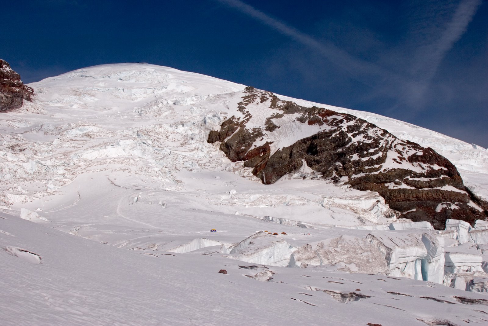 Cowlitz Glacier – just above and to the north of Camp Muir – notice the amount of opening that has happened recently in the Glacier. If you look really close you can see the moved the trial leading from Camp Muir to Disappointment Clever from just above this to much higher above this Crevasse.