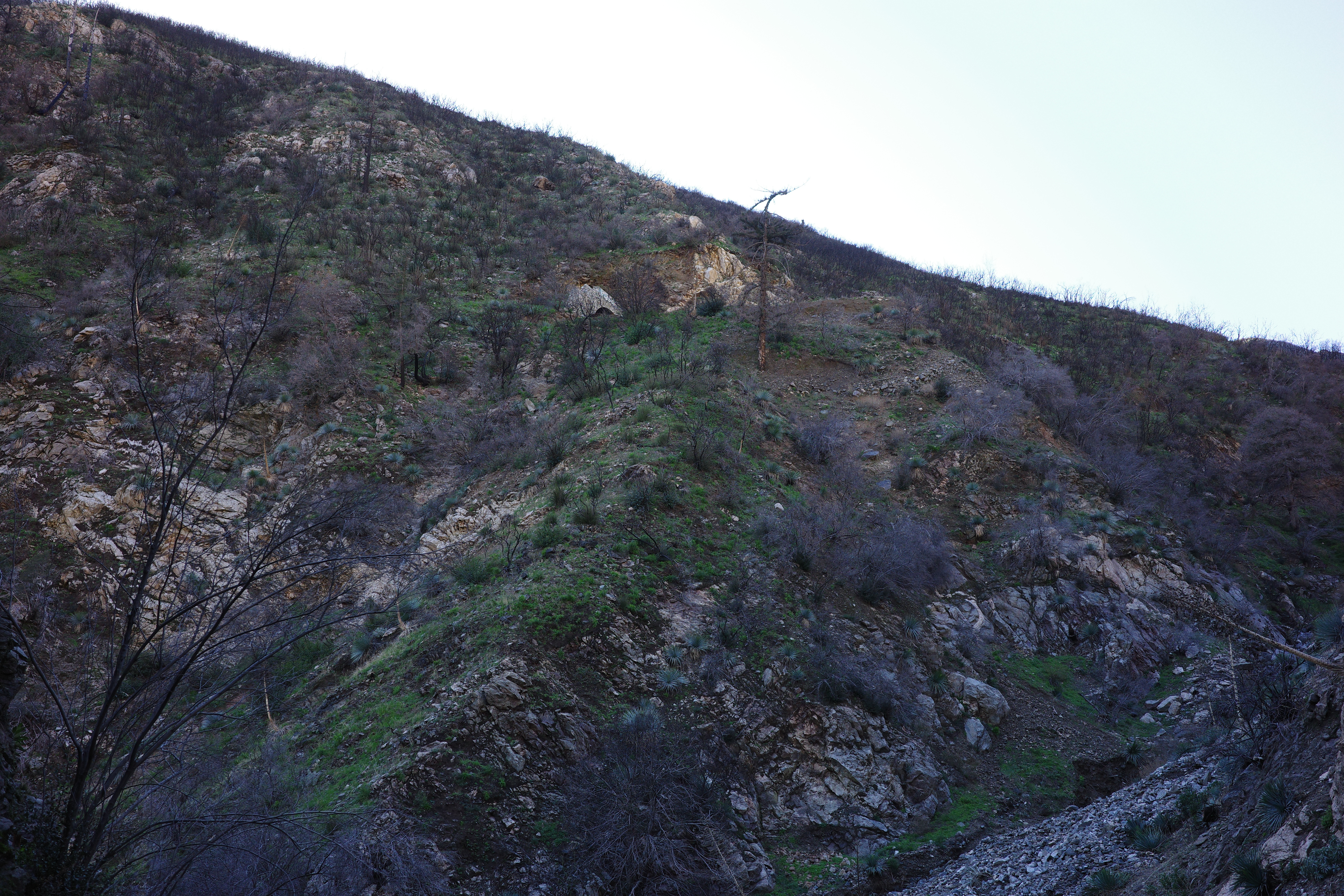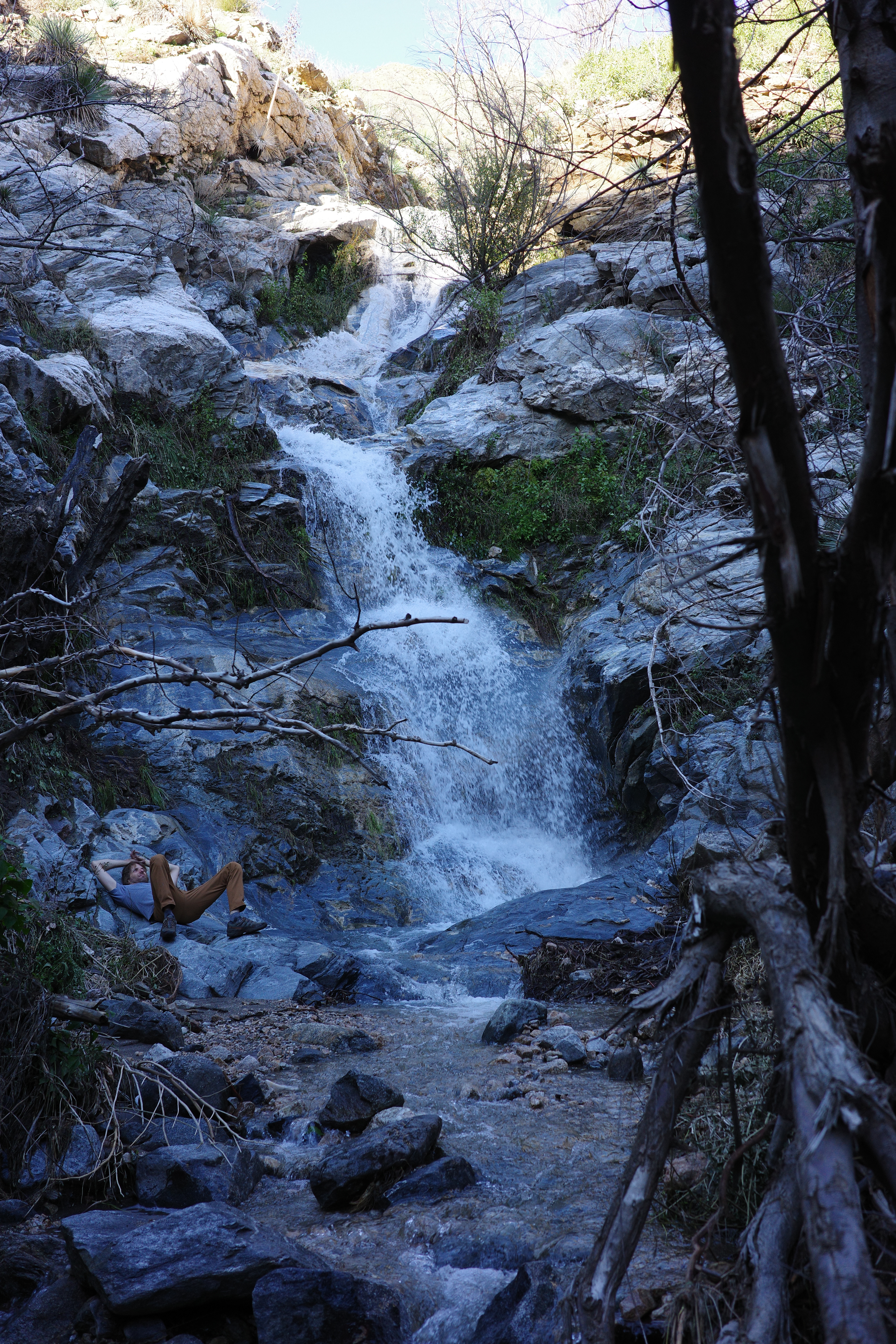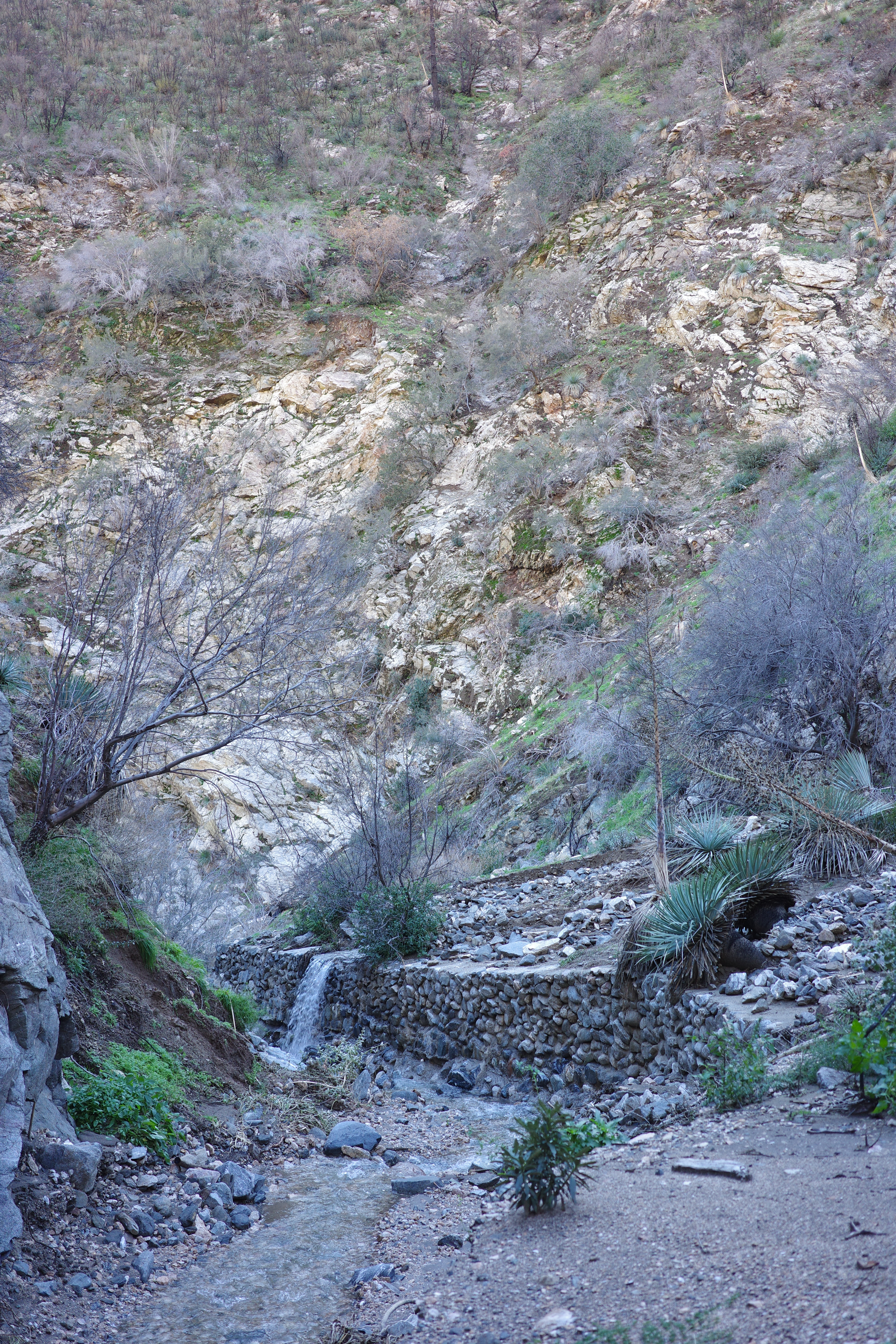 Shoemaker canyon is pretty washed out from the rains and wildfire so there’s plenty of loose boulders and crazy erosion to see. The dams that we saw from above were filled in with debris and we also don’t quite know what their purpose was. My guess is that they were built to collect debris during the construction of the Bridge to Nowhere road but maybe Taco knows the true history there. We discovered this pretty step waterfall next to the dams which really iced out the cake for us that day!